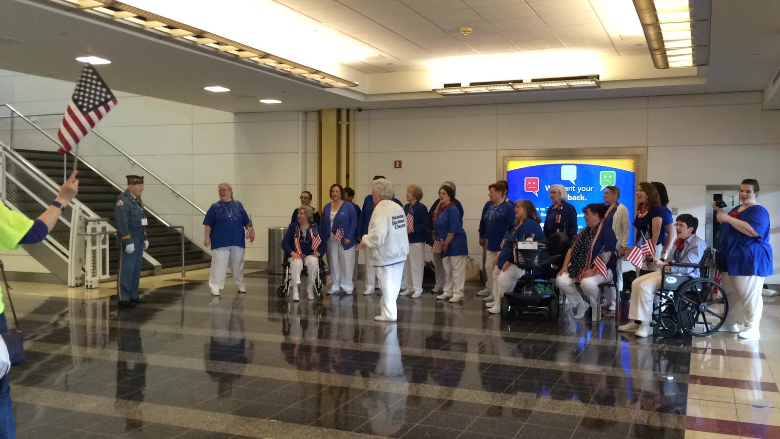 I waited while another veteran followed the first one, then found a bank of escalators to ride to the bottom floor baggage claim. As I rode down, I could hear sounds of the next stop in the Honor Flight celebration: a female choral group greeting the uniformed veteran with the Army song, "The Army Goes Rolling Along." Of course, I stopped here too, tears welling up in my eyes.